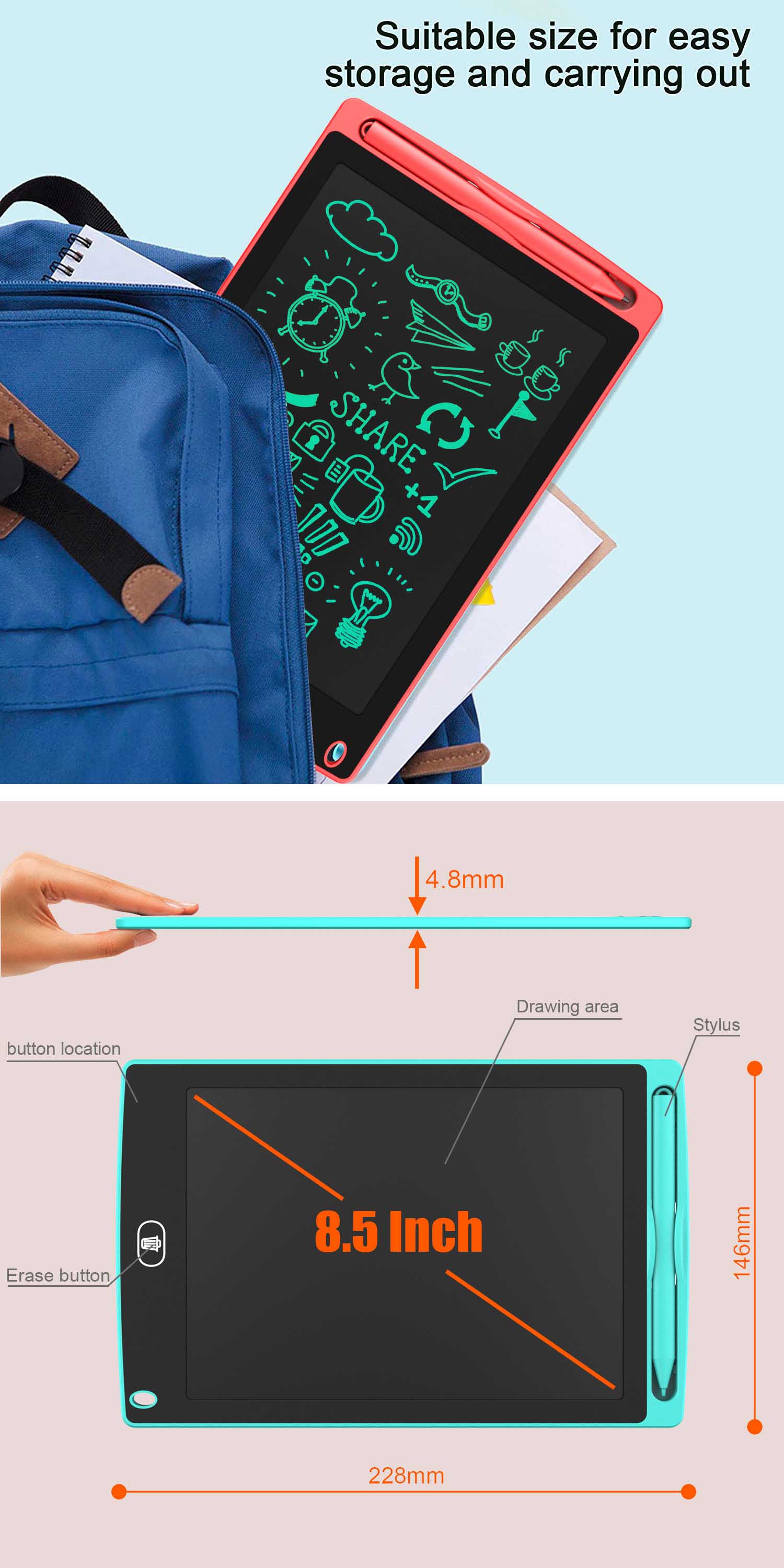 The LCD writing tablet adopts LCD pressure-sensitive technology and 8.5-inch LCD Solid Color screen.This toddler doodle board without radiation, no glare, safe and comfortable for a long time using, offers enough space for graffiti and easy viewing, free child’s imagination and creation, provide better preschool learning experience!