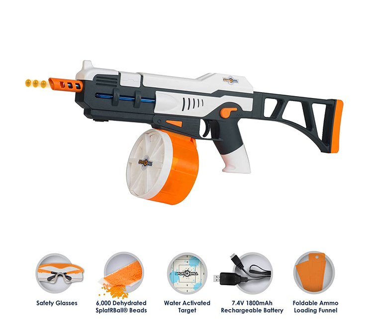 Complete Kit: Includes the water bead gel blaster, 1,200 round water ball drum magazine, water ball GELBLASTER ammunition, safety glasses, collapsible easy loading funnel, Rechargeable 7.4V 1800mAh battery with charging cable and GELBLASTER water ball activated target!